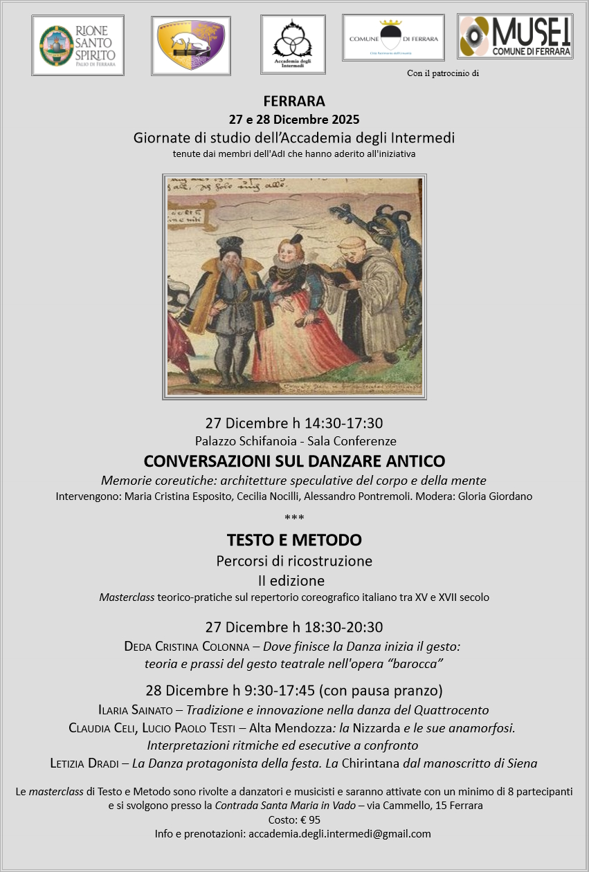 I prossimi 27 e 28 Dicembre a Ferrara si svolgerà Testo e Metodo. Percorsi di ricostruzione, seconda edizione delle giornate dedicate al repertorio coreografico italiano fra XV e XVII secolo che proseguono l’esperienza dell’edizione 2024.